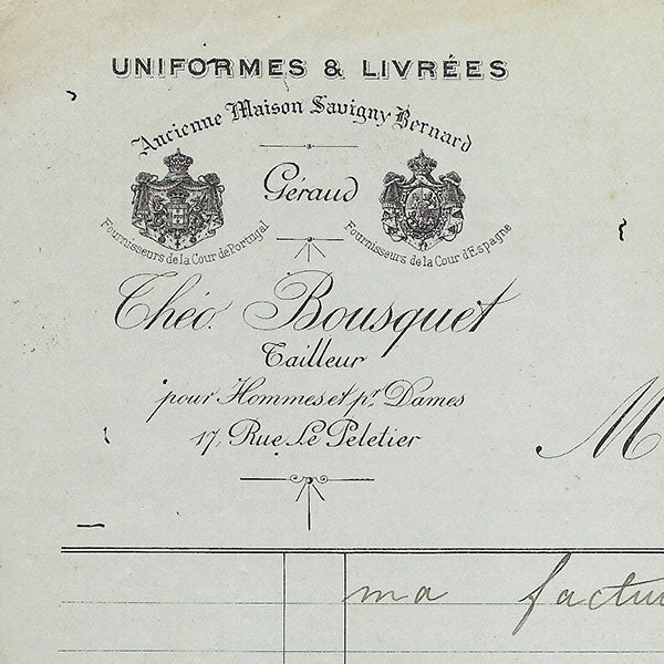 Facture de 1908 du tailleur Théo Bousquet situé 17 rue Le Peletier à Paris. La maison fournissait le roi du Portugal ainsi que la cour d'Espagne.